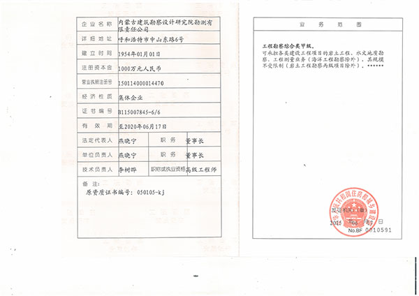 • 內蒙古建筑勘察設計研究院勘測有限責任公司,是全國首家完成 轉企建制的省級建筑勘察設計單位。公司前身為內蒙古建筑勘察 設計研究院勘測分院, 成立于1954年 ,經過六十多年的發(fā)展, 現(xiàn)已成為全區(qū)技術力量雄厚、專業(yè)設置齊全的集巖土工程勘察 、 設計、治理、檢測、監(jiān)理、咨詢、水文地質勘查、工程測量、科 研為一體的綜合性企業(yè) ... ... [查看詳情]